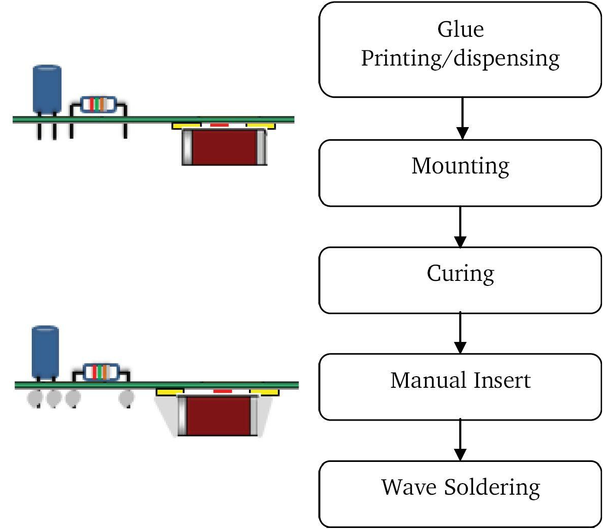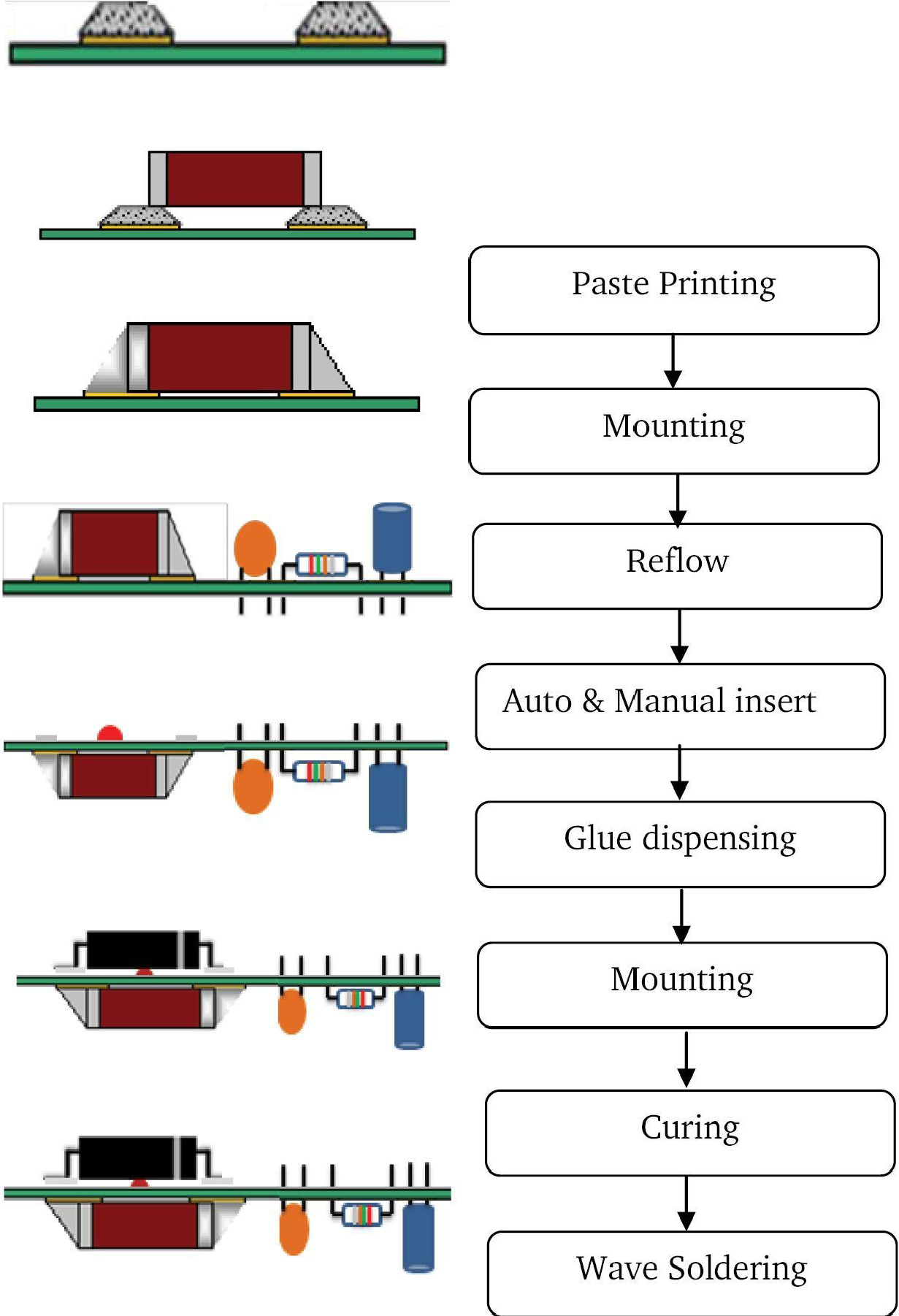 The PCB first enters in a pre-heat zone, where the temperature of the board and all thecomponents are gradually, uniformly raised. The boards then enter a zone where thetemperature is high enough to melt the solder particles in the solder paste, bonding thecomponent to the pads on the circuit board.