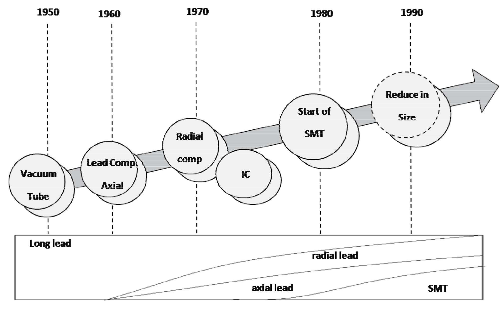 Surface mount technology started in 1950’s when surface mount components were appliedfor the first time to military supplies. In 1960’s the surface mount technology grew out oflimited hybrid circuit products market and attached with ceramic to the surface ofmaterial.